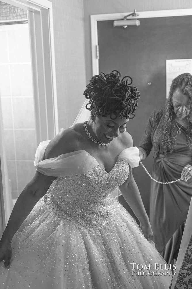 Several weeks ago I photographed the wedding of Venita and Mike on the Waterways cruise boat Emerald Star. The day began when I met bride Venita and her bridesmaids at the nearby hotel where they were getting dressed before the wedding. This was quite an experience, as there were a LOT of people trying to get dressed in a rather small space, as you’ll see in some of the photos below. This was actually a lot of fun to photograph, as pre-wedding chaos is almost always fun for all involved.