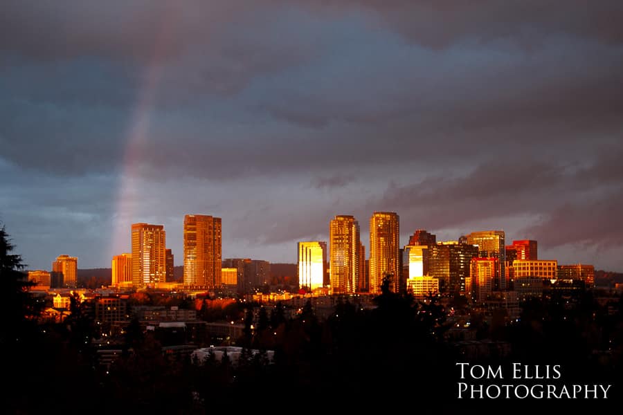 As I drove up the hill to the location, I was able to see all of downtown Bellevue below and to the east.  The light was reflecting off of the buildings, and there was even a huge rainbow that completely spanned the city.  I jumped out of the car and started shooting.  Within the space of less than a minute the sun dropped low enough that there was no longer any light hitting the city, and the moment was gone.  I only wish i had gotten there 15 minutes earlier, I’d probably still be sorting and editing the photos I might have taken.  But I did get a few good shots, and here is my favorite.  Hope you like it!
