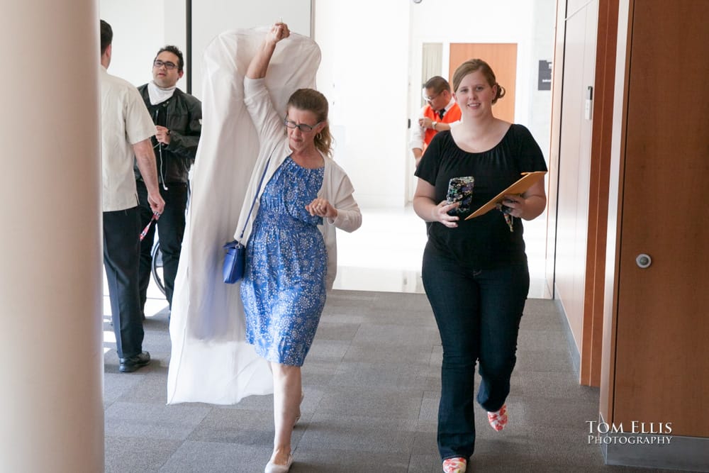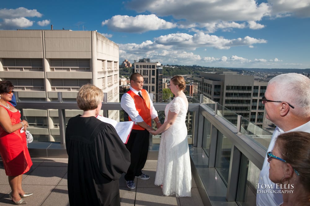 When Michelle and James contacted me last spring about photographing their wedding, they told me that they were planning to have a quick wedding at the Seattle municipal court building, followed a couple of weeks later with a large party/reception on the roof of their apartment building for all of their family and friends. I have done numerous weddings at the Seattle Courthouse, and mentioned that they should be sure to ask about getting married on the roof of the building, rather than in the judges chambers, if the weather was cooperative. The view from the roof is fantastic, and it is a great place for a small wedding.