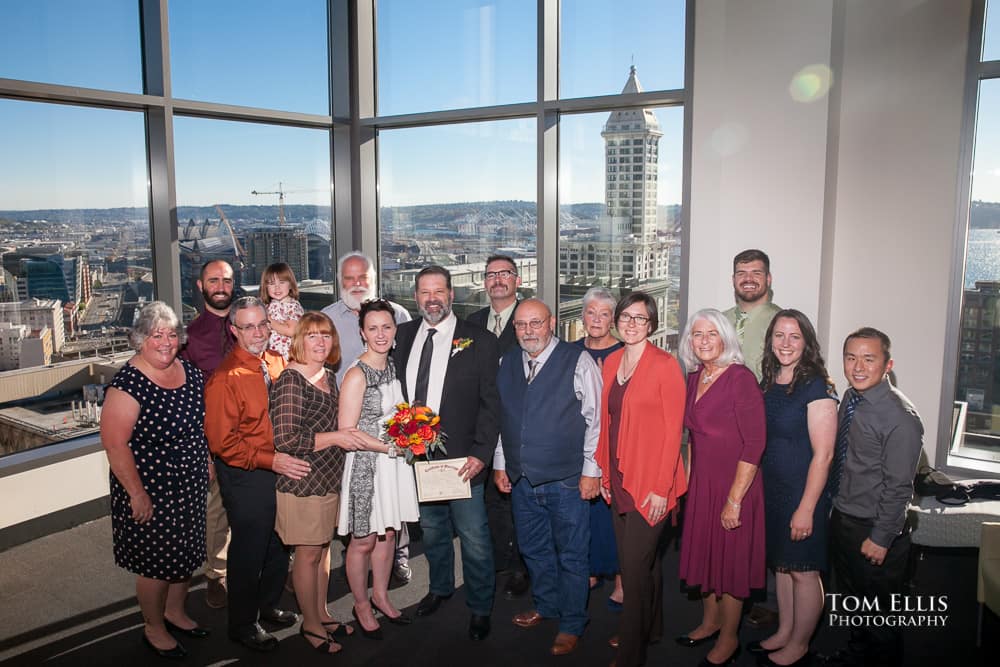 Because John and Kate had a larger than usual contingent for a courthouse wedding they were placed in the Jury Selection Room for their ceremony. This is a big and bright room with sweeping views of south Seattle, Puget Sound and (on a sunny day like this) Mt Rainier. After we finished taking photos, we all moved upstairs to the Jury Selection room and the ceremony was held. Afterwards we did some more family photos in the room, and then I took Kate and John outside to the roof terrace for a few photos with Mt Rainier and the Smith Tower in the background. Then it was time for John, Kate and their group to head off for a big dinner.