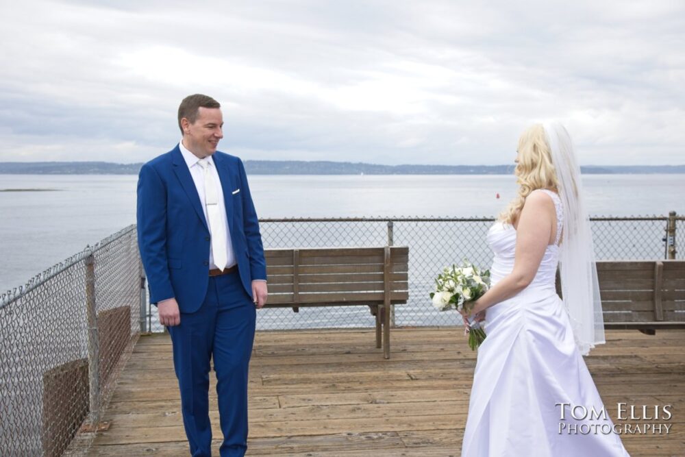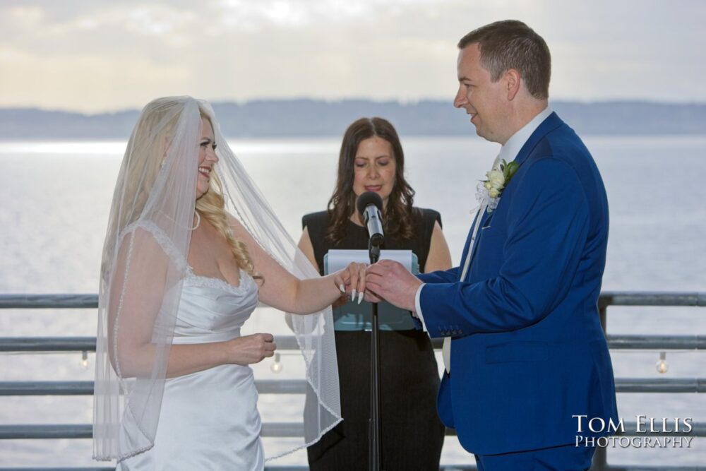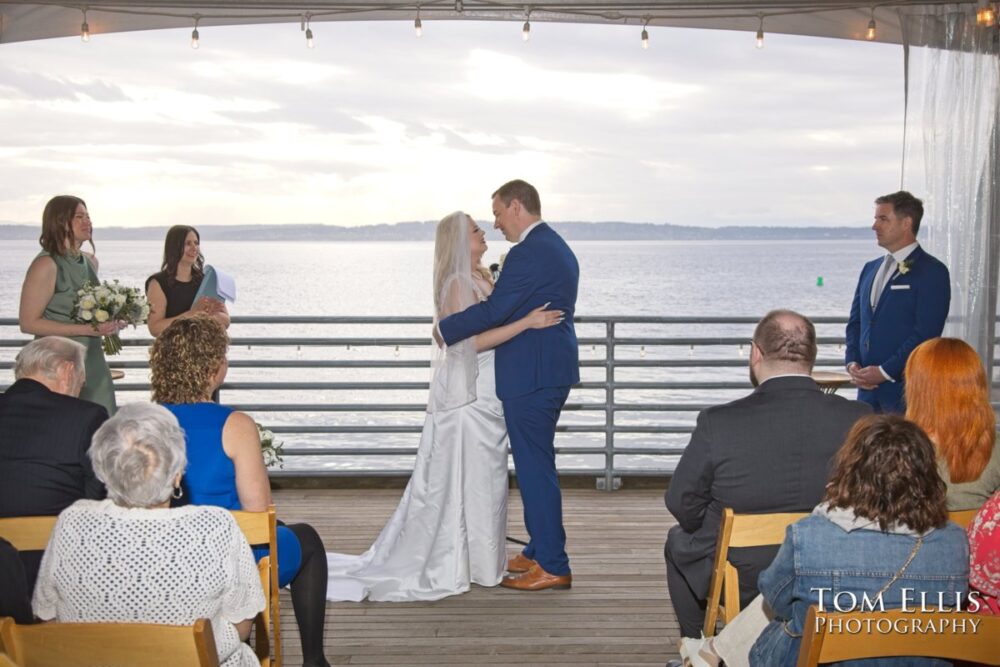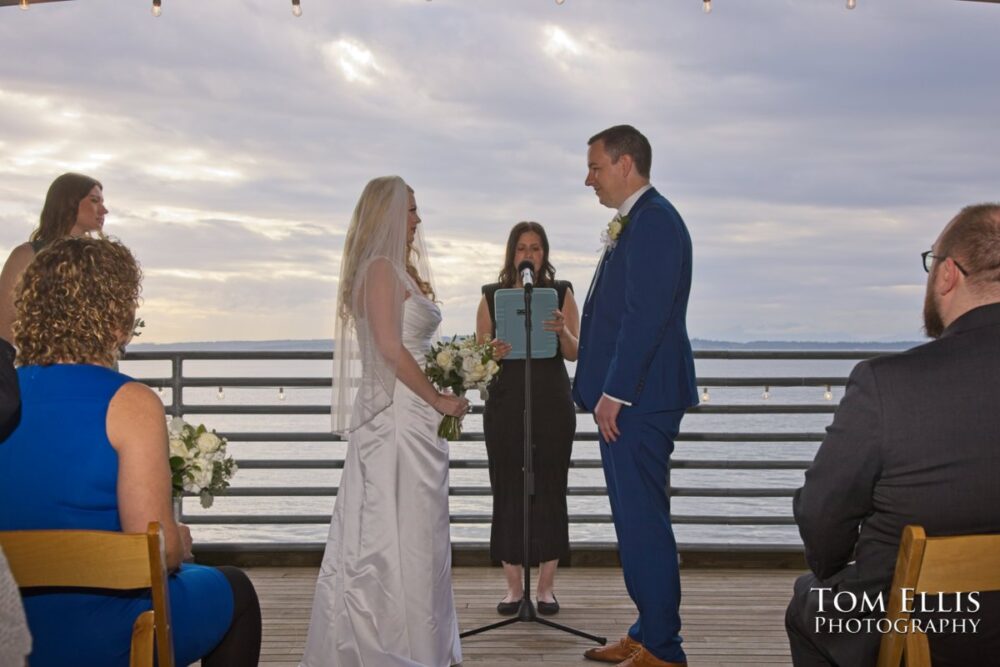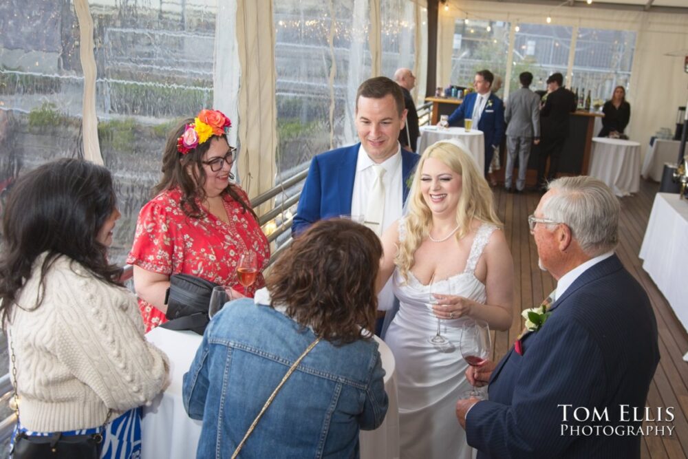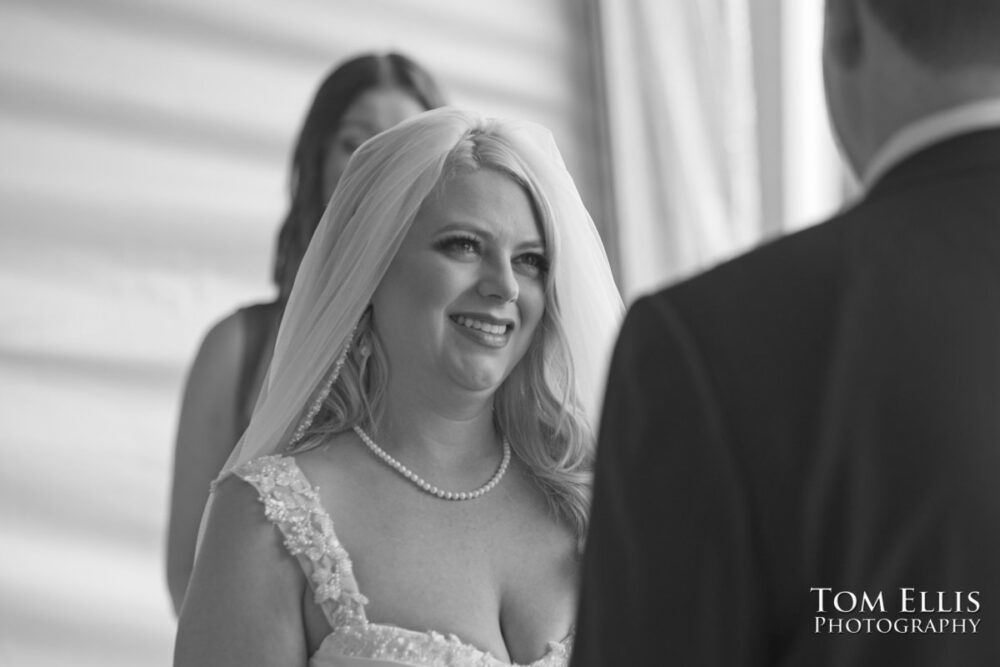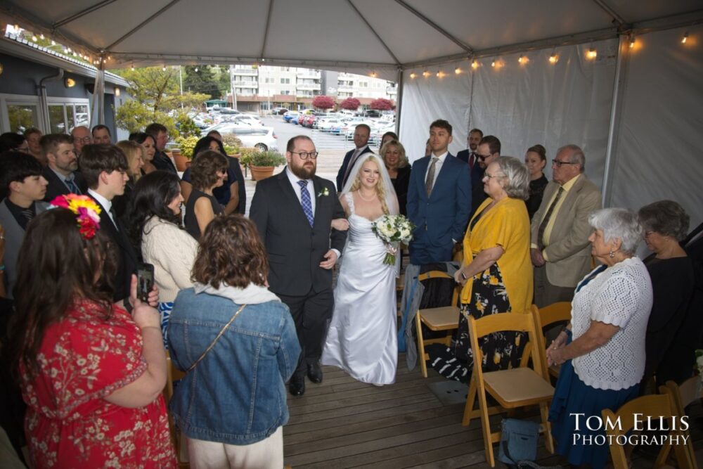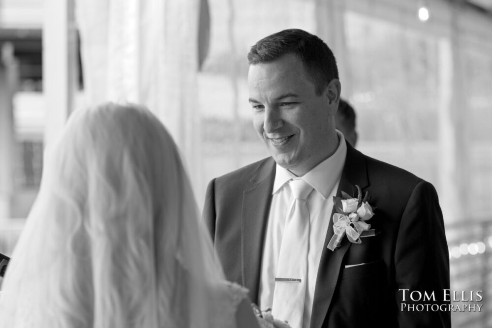 Then we headed back to Ray’s, and Sam hid out for a few minutes until it was time for the ceremony to begin. Ray’s has a setup for weddings that is quite unique in the Seattle area. They have a year-round covered deck that can be used for weddings in any weather, with drop-down clear curtains and heaters that even make it perfect for winter weddings. Today’s weather was quite pleasant, so the curtains were removed and we had a great backdrop of Shilshole Bay with the Olympic Peninsula in the distance. Again, photos below.