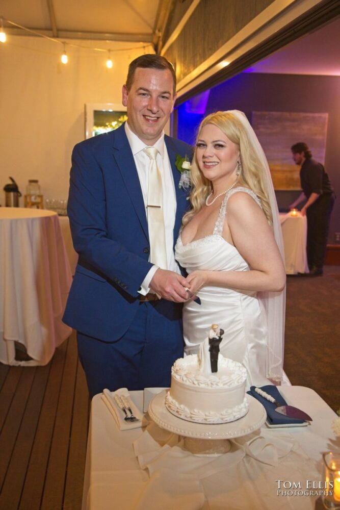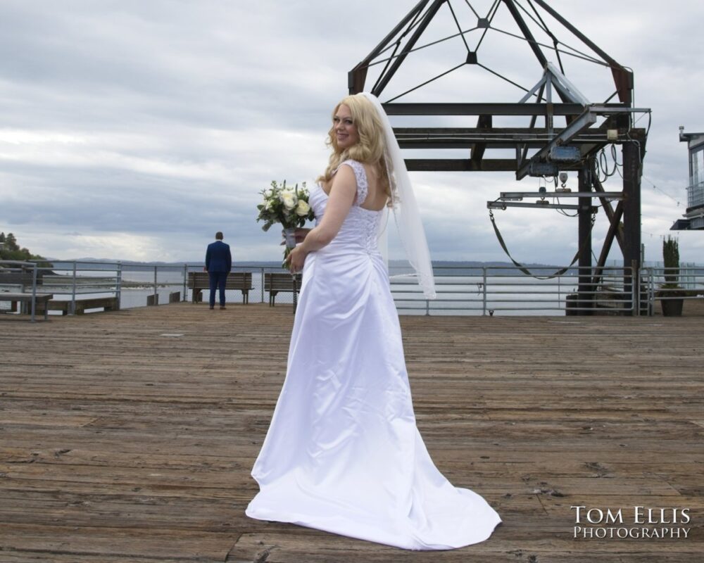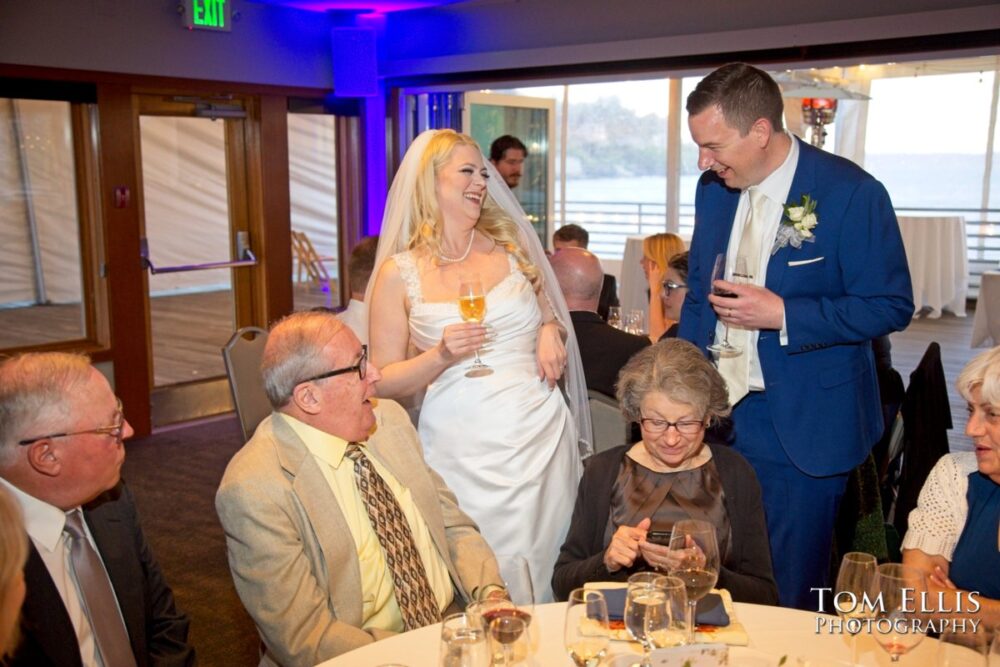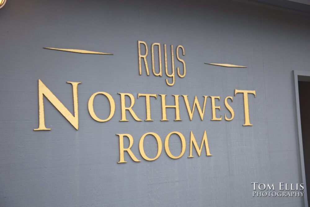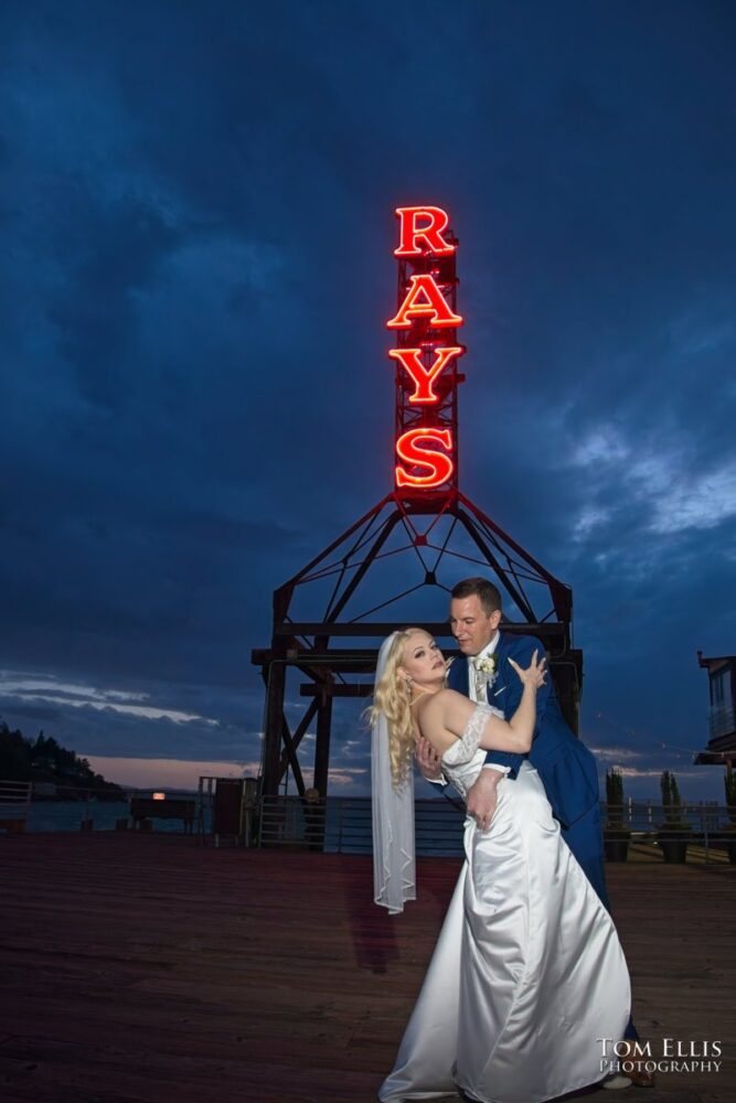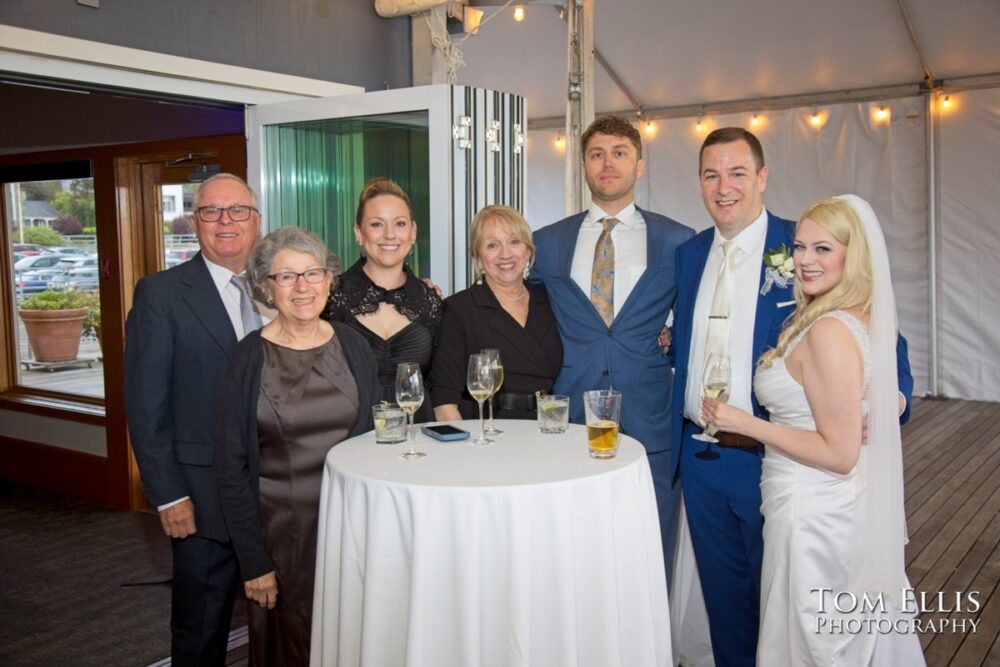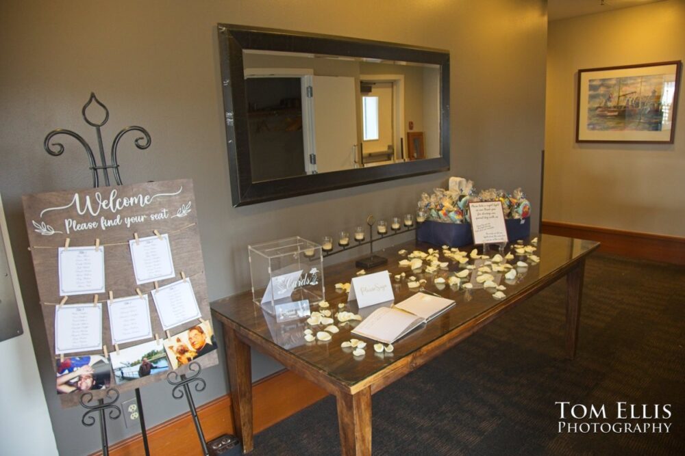 Then we headed back to Ray’s, and Sam hid out for a few minutes until it was time for the ceremony to begin. Ray’s has a setup for weddings that is quite unique in the Seattle area. They have a year-round covered deck that can be used for weddings in any weather, with drop-down clear curtains and heaters that even make it perfect for winter weddings. Today’s weather was quite pleasant, so the curtains were removed and we had a great backdrop of Shilshole Bay with the Olympic Peninsula in the distance. Again, photos below.