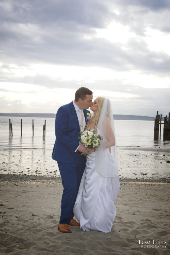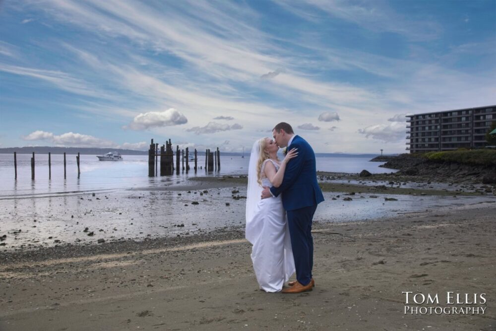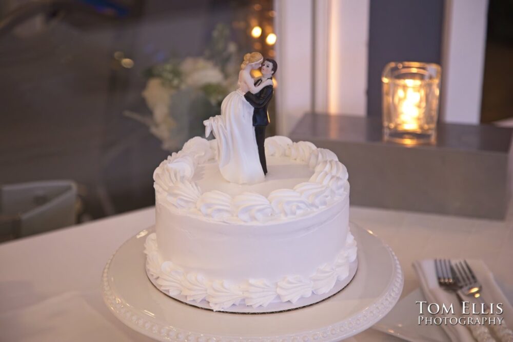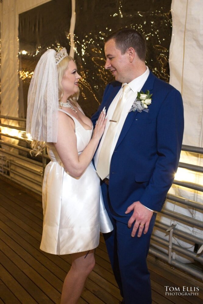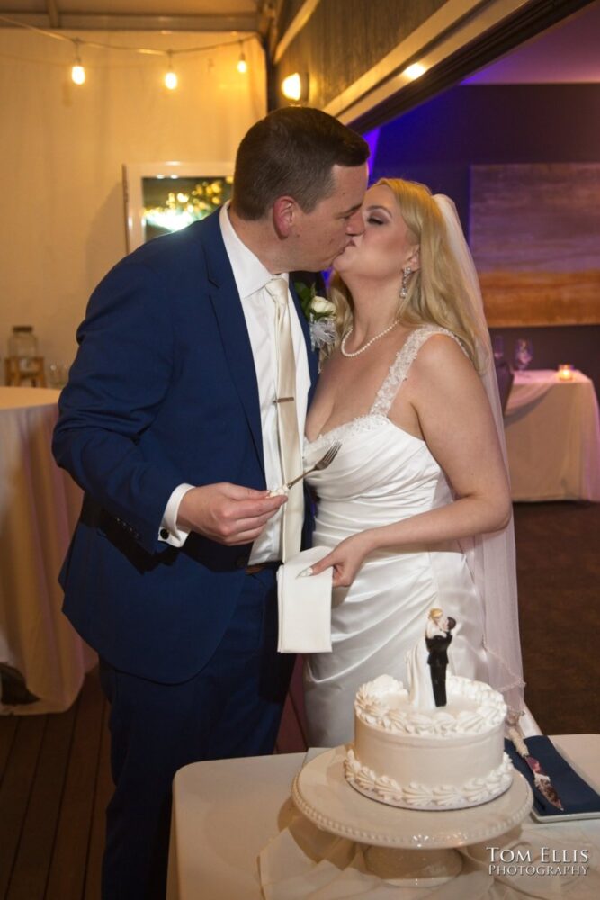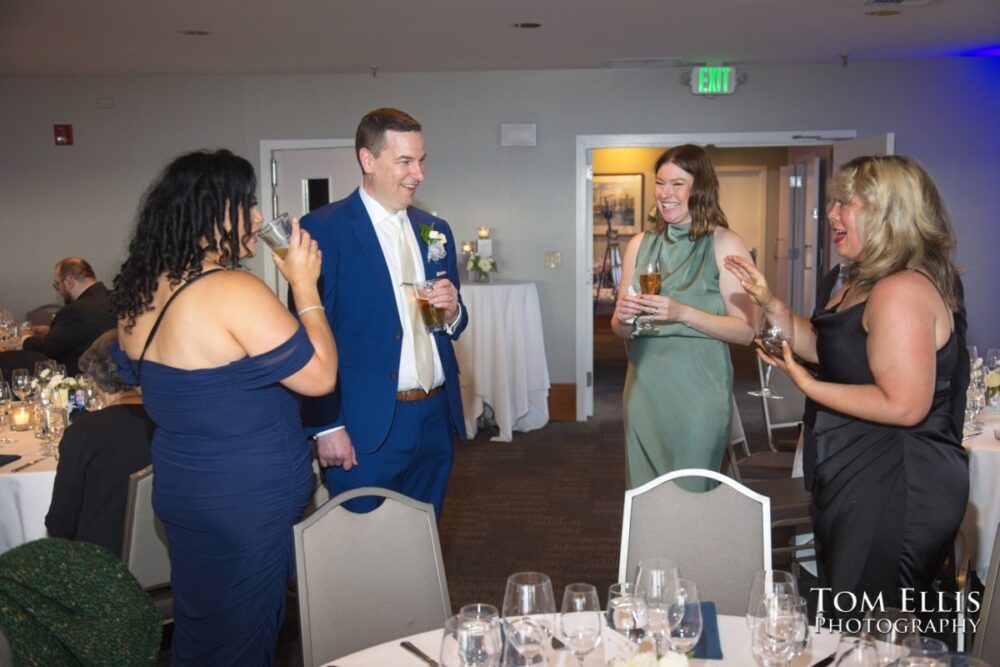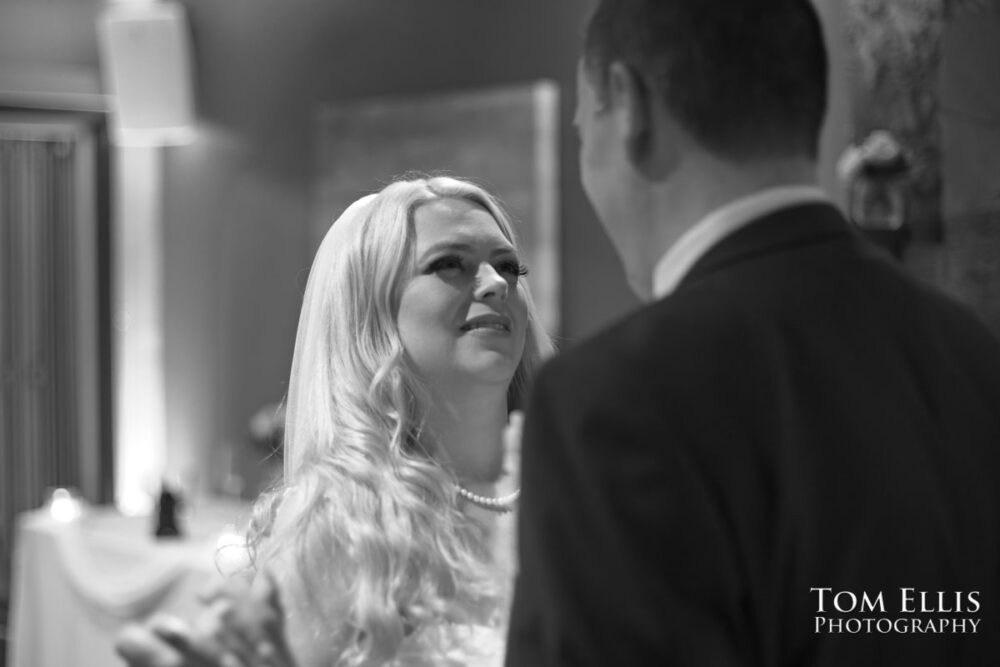 Then we headed back to Ray’s, and Sam hid out for a few minutes until it was time for the ceremony to begin. Ray’s has a setup for weddings that is quite unique in the Seattle area. They have a year-round covered deck that can be used for weddings in any weather, with drop-down clear curtains and heaters that even make it perfect for winter weddings. Today’s weather was quite pleasant, so the curtains were removed and we had a great backdrop of Shilshole Bay with the Olympic Peninsula in the distance. Again, photos below.