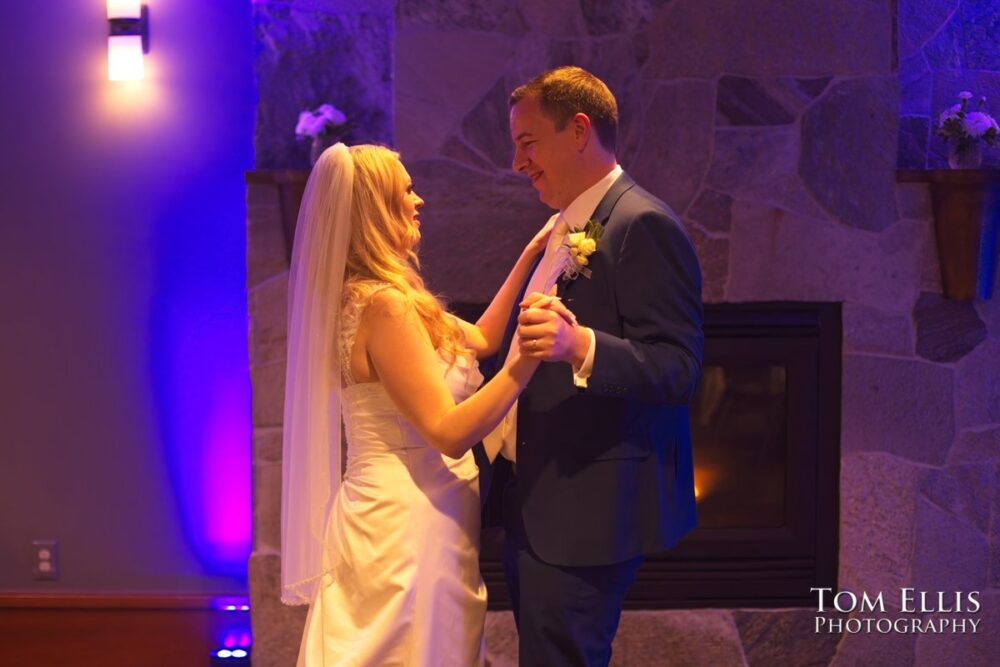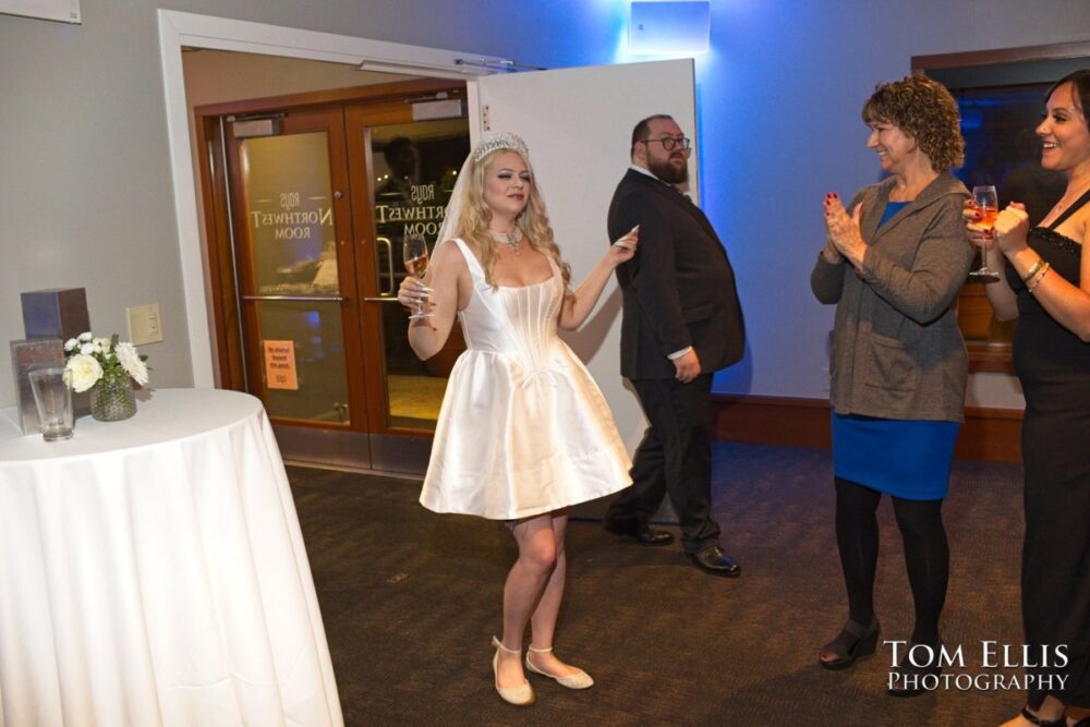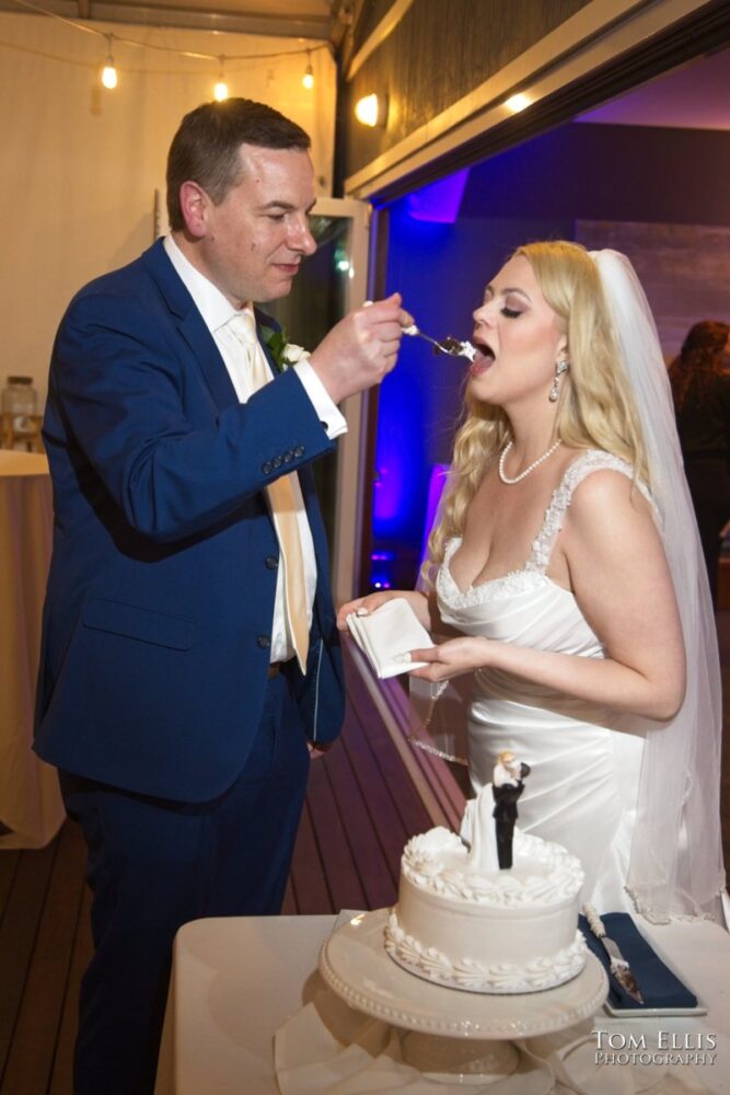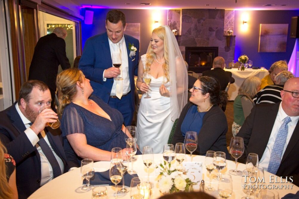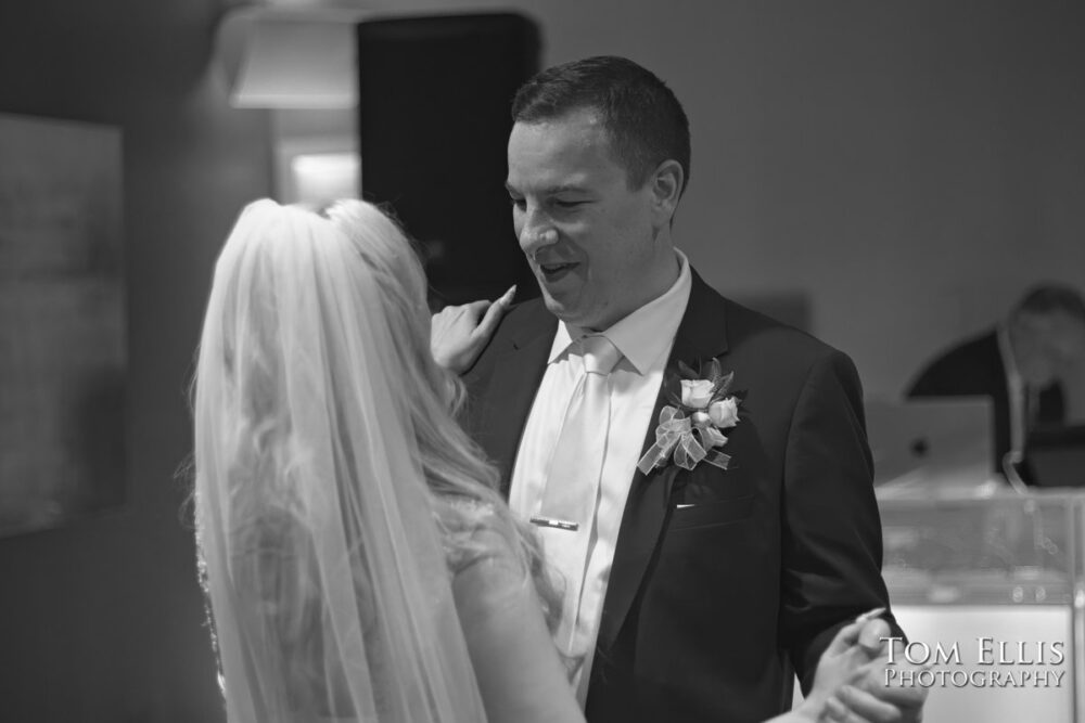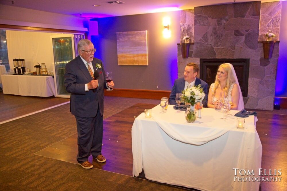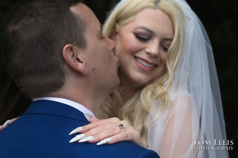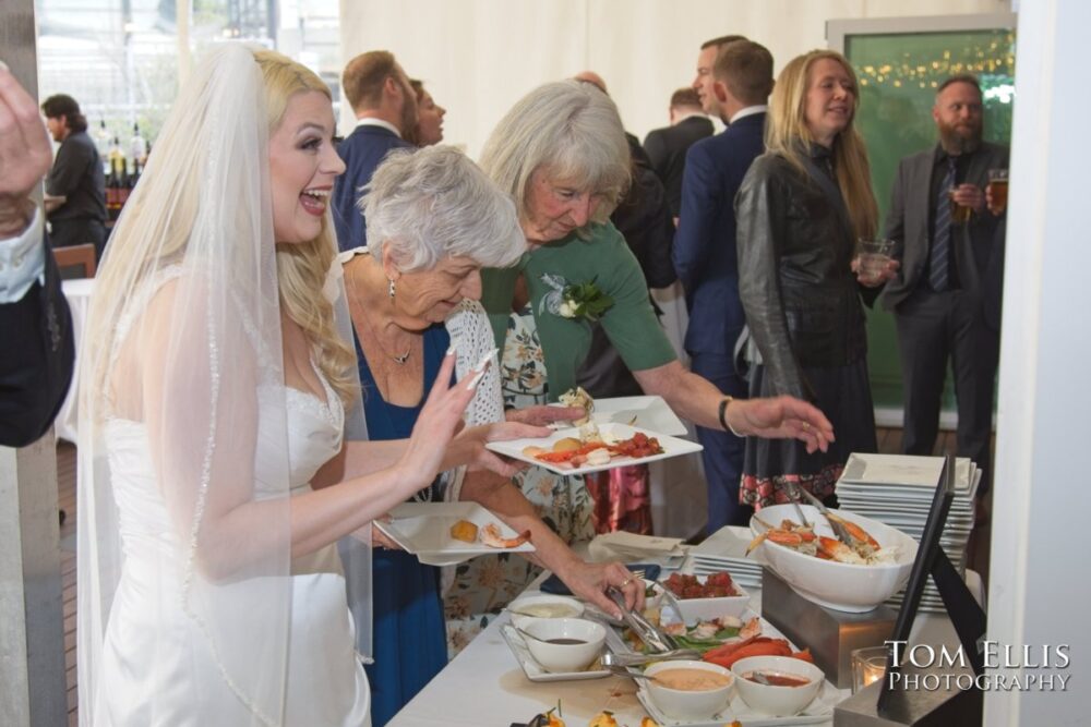 Then we headed back to Ray’s, and Sam hid out for a few minutes until it was time for the ceremony to begin. Ray’s has a setup for weddings that is quite unique in the Seattle area. They have a year-round covered deck that can be used for weddings in any weather, with drop-down clear curtains and heaters that even make it perfect for winter weddings. Today’s weather was quite pleasant, so the curtains were removed and we had a great backdrop of Shilshole Bay with the Olympic Peninsula in the distance. Again, photos below.